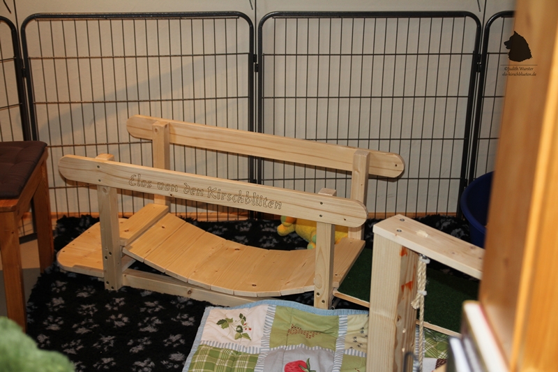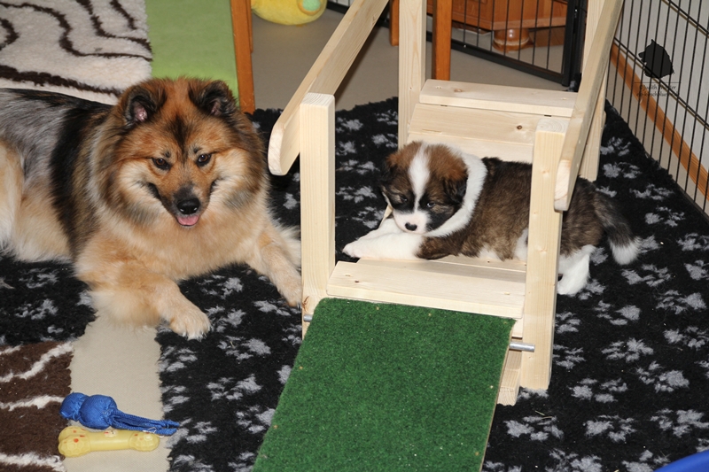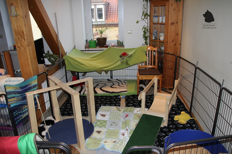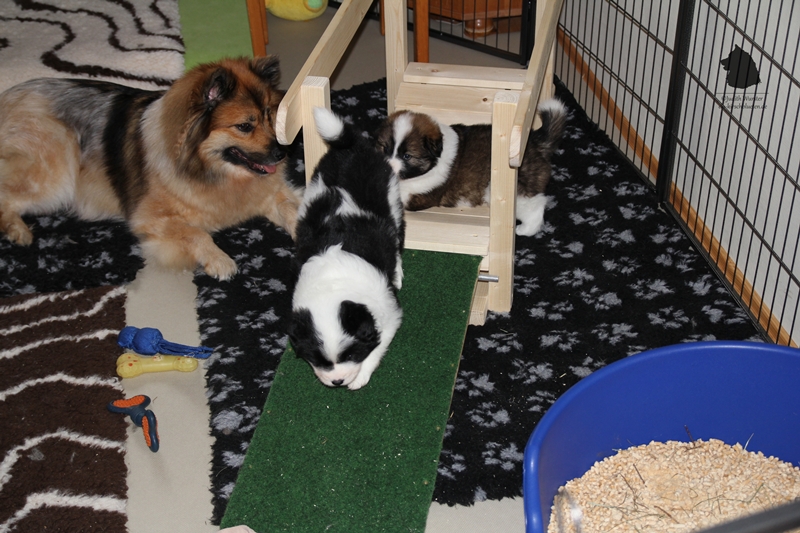 Die Welpen wachsen bei uns mit engem Familienanschluss auf. Während wir Würfe aufziehen, stehen in unserem Esszimmer Wurfkiste und Welpen Auslauf. Sind die Welpen alt genug, dürfen sie bei gutem Wetter stundenweise in den Hof, um ihre Umwelt besser kennen zu lernen. Bis die Welpen bei uns ausziehen, prägen wir sie auf so viele Umwelteinflüsse wie möglich, wie z.B. das Autofahren oder Regenschirme.